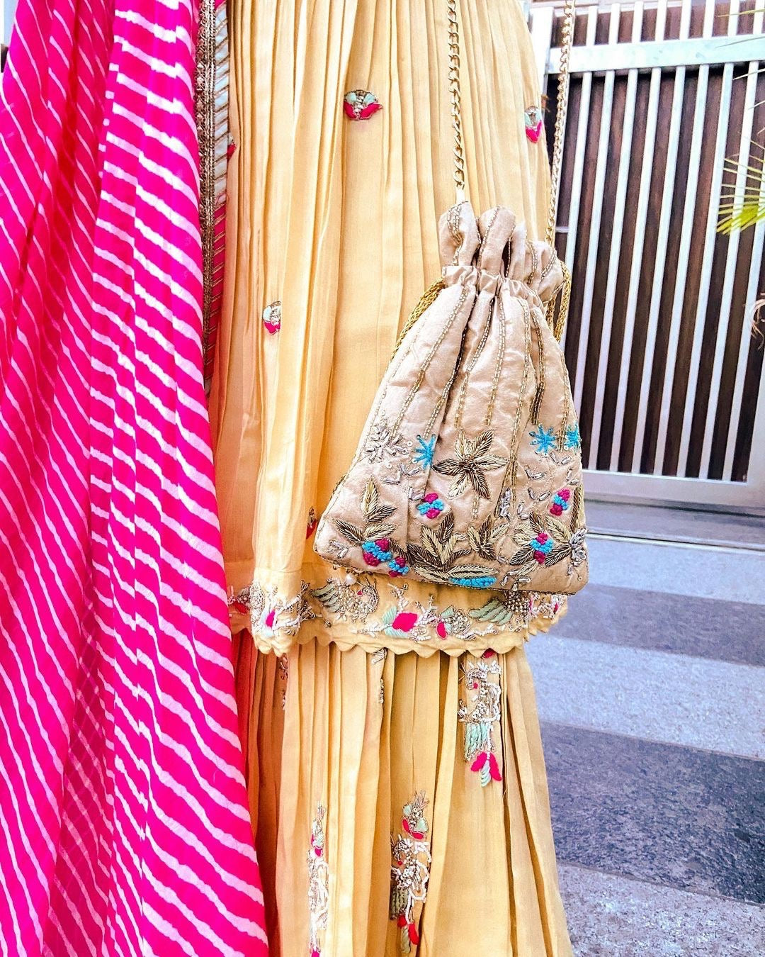 - Traditional Indian Elegance: Enhance your ethnic wear by pairing the potli bag with a vibrant saree or lehenga for a graceful and traditional look.