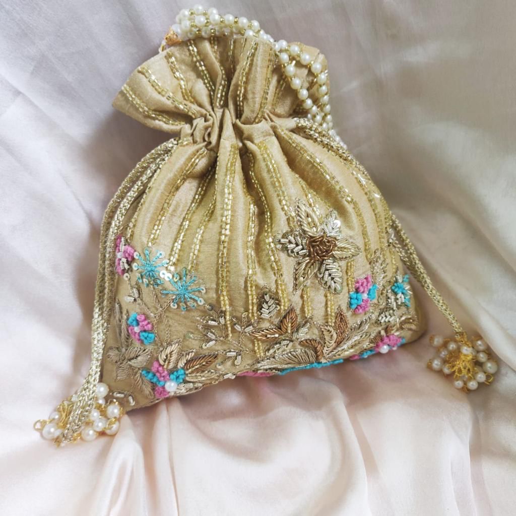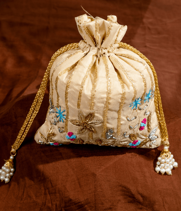 - Cleaning: Gently wipe the surface of the potli bag with a soft damp cloth to remove any dirt or stains.