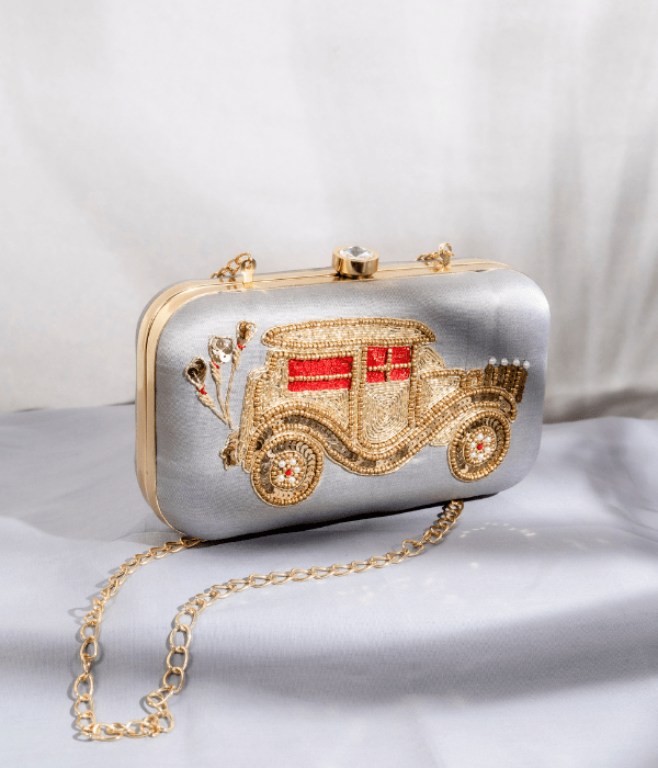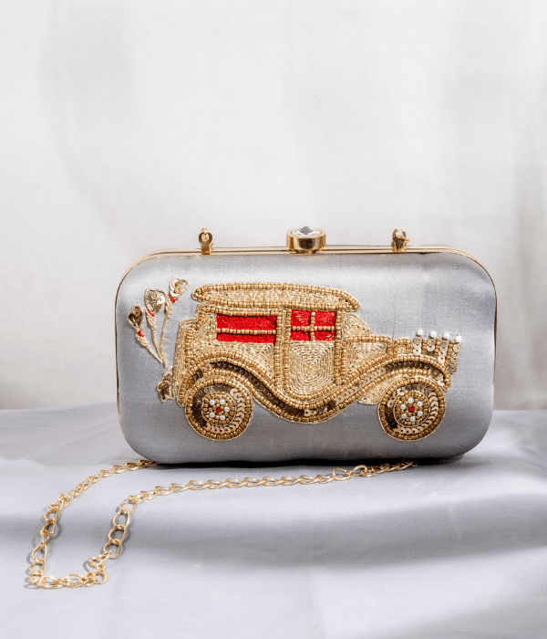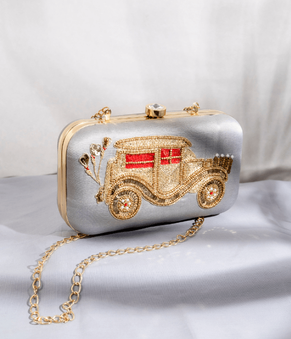 Introducing the Mojabella Box Clutch Bag in a captivating metallic grey hue. This rectangular-shaped clutch is more than just an accessory; it's a bold fashion statement. The meticulously handcrafted vintage car design adds a touch of unique charm to this exquisite piece.