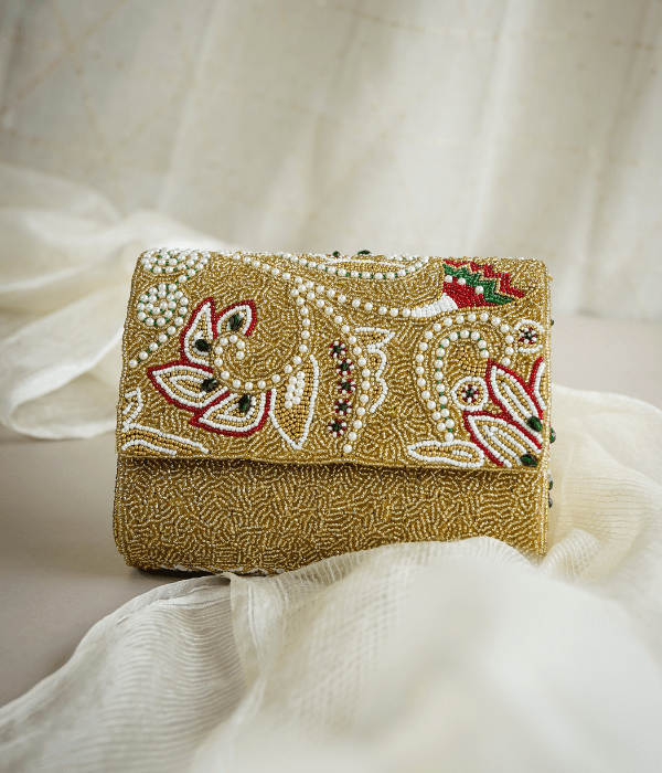 Introducing the Natural and Gold Fold Over Clutch - Elevate your party or ethnic collection with this stunning clutch. Its natural color with gold sequin embellishments makes it a perfect accessory for special occasions. Now, let's explore how to style and care for this exquisite piece.