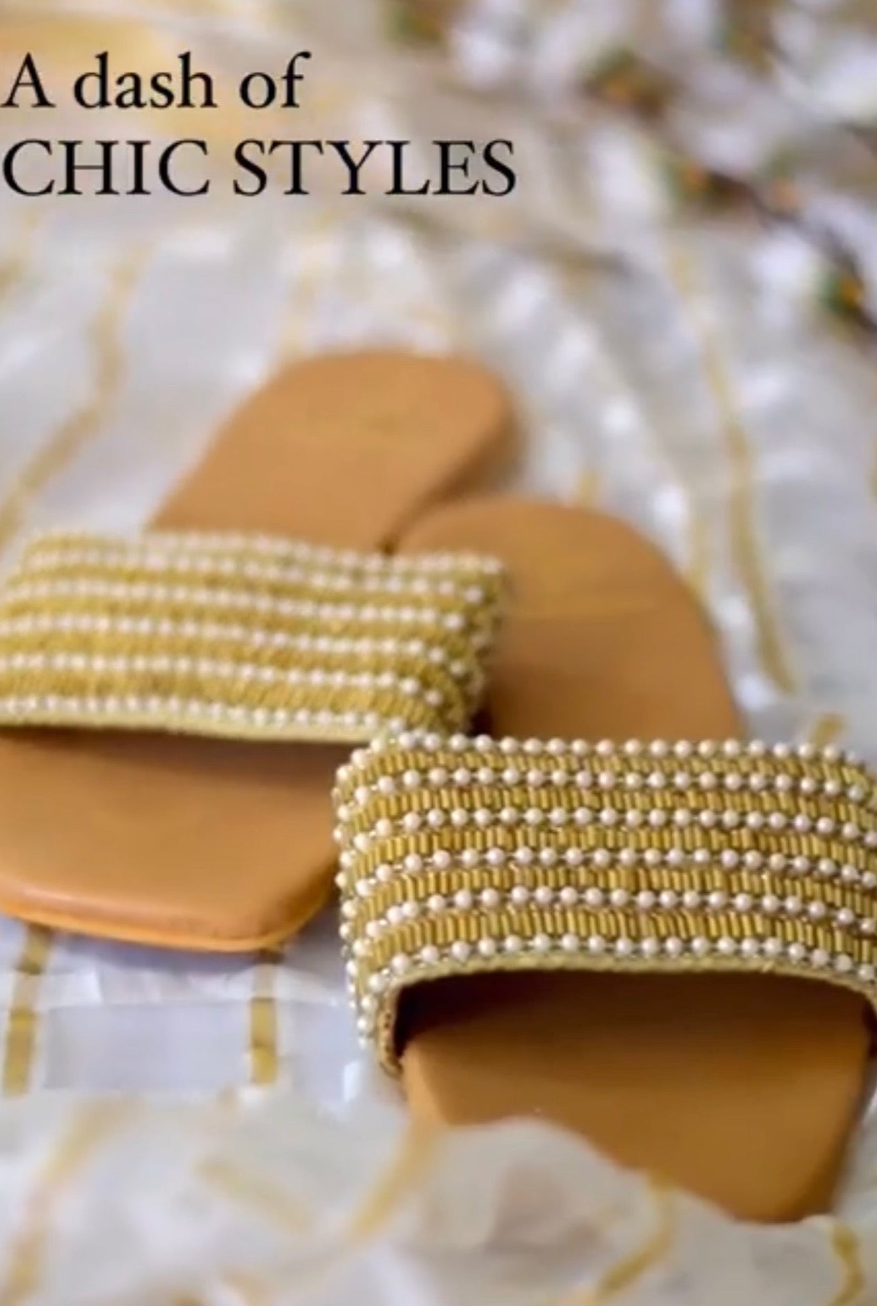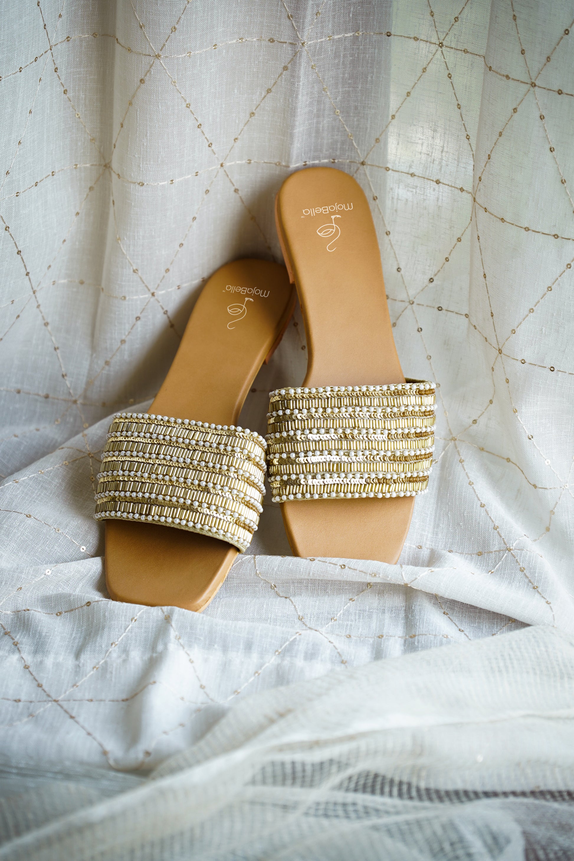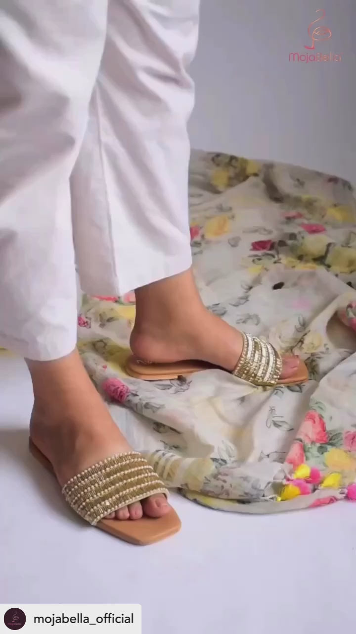 Prepare to be enchanted by the luxurious blend of style and comfort that these sandals offer. Drenched in radiant golden elegance, they feature captivating details - from the lustrous golden piping to the intricate vertical white bead lines that create a harmonious dance of opulence.